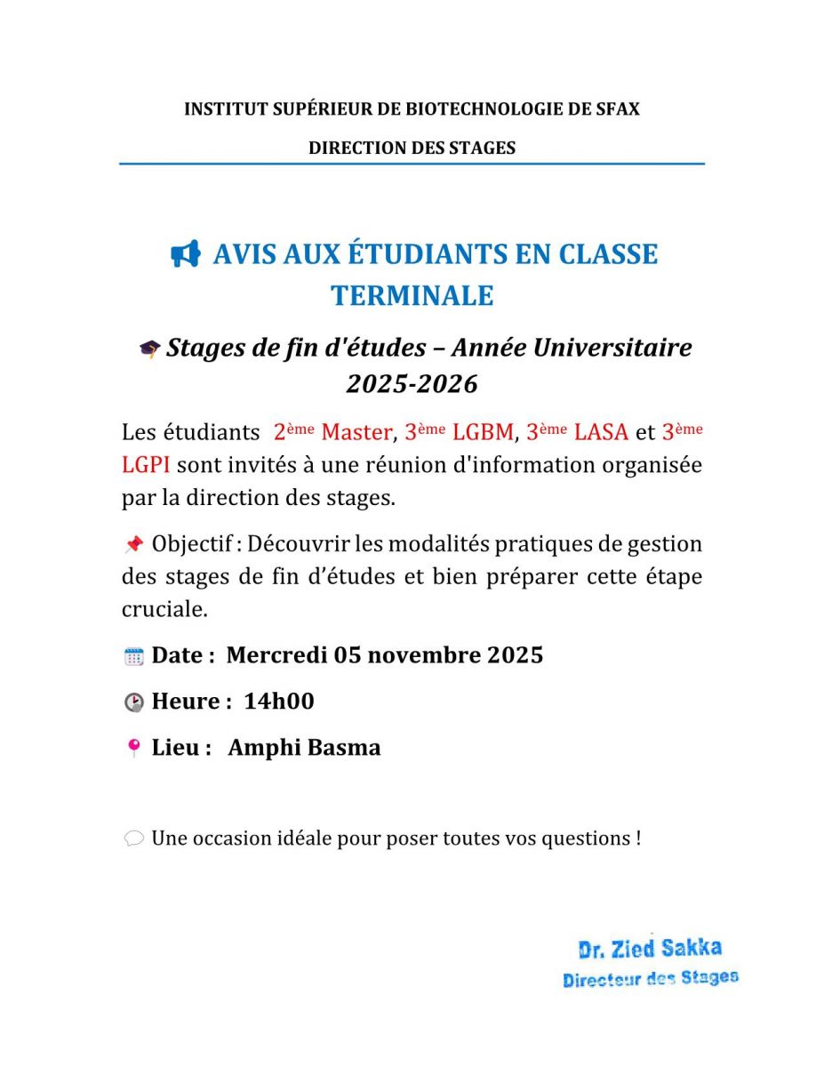 Rappel: Réunion organisée par la direction des stages 5/11/2025